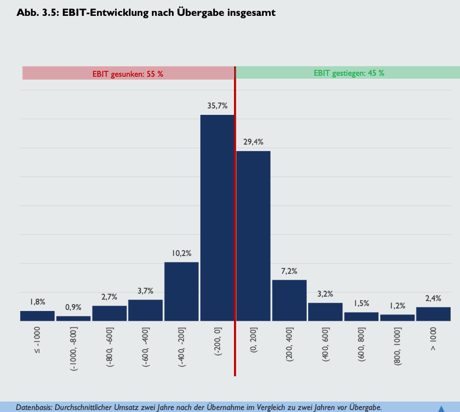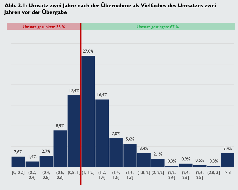 Lt. deutschen Nachfolgemonitor steigt der Umsatz bei rd. 2/3 der Unternehmen zwei Jahre nach der Übernahme. Diese erfreuliche Erkenntnis spricht für die Übernahme eines bestehenden Unternehmens gegenüber der in der Regel deutlich riskanteren Neugründung .