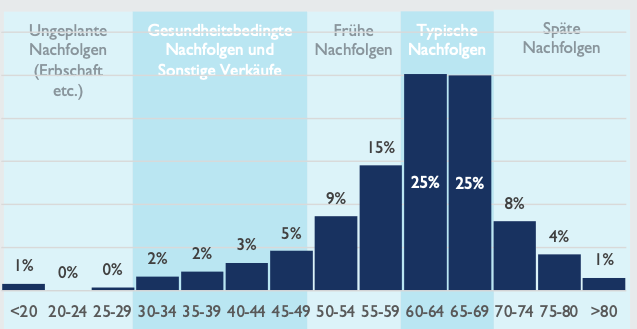 Betrachtet man das Alter der Übergebenden im Nachfolgemonitor, so entfallen nur rd. 50% auf typische altersbedingte Übergaben (zwischen 60 und 69 Jahren).