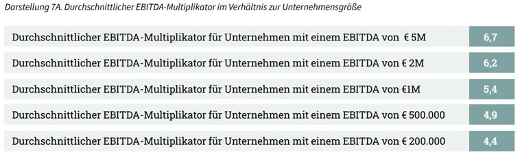 Lt. Dealsuite betrug der Abschlag 2022 von einem Unternehmen mit einem EBITDA von € 5 Mio. zu einem Unternehmen mit einem EBTIDA von € 200.000. beachtliche 34%.